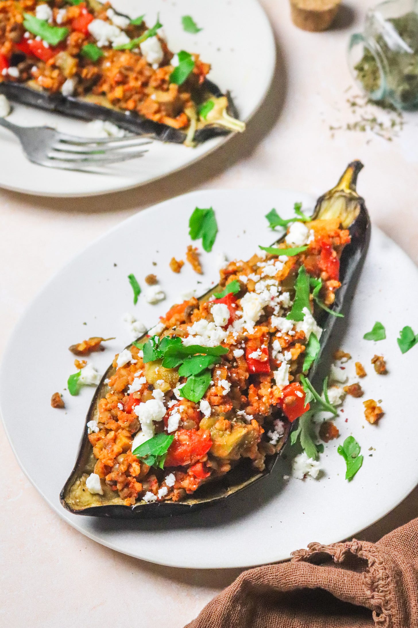 Quand les aubergines sont bien cuites, prélever la chair à l’aide d’une cuillère à soupe en gardant la peau. Mélanger la chair cuite à la farce et garnir les aubergines.