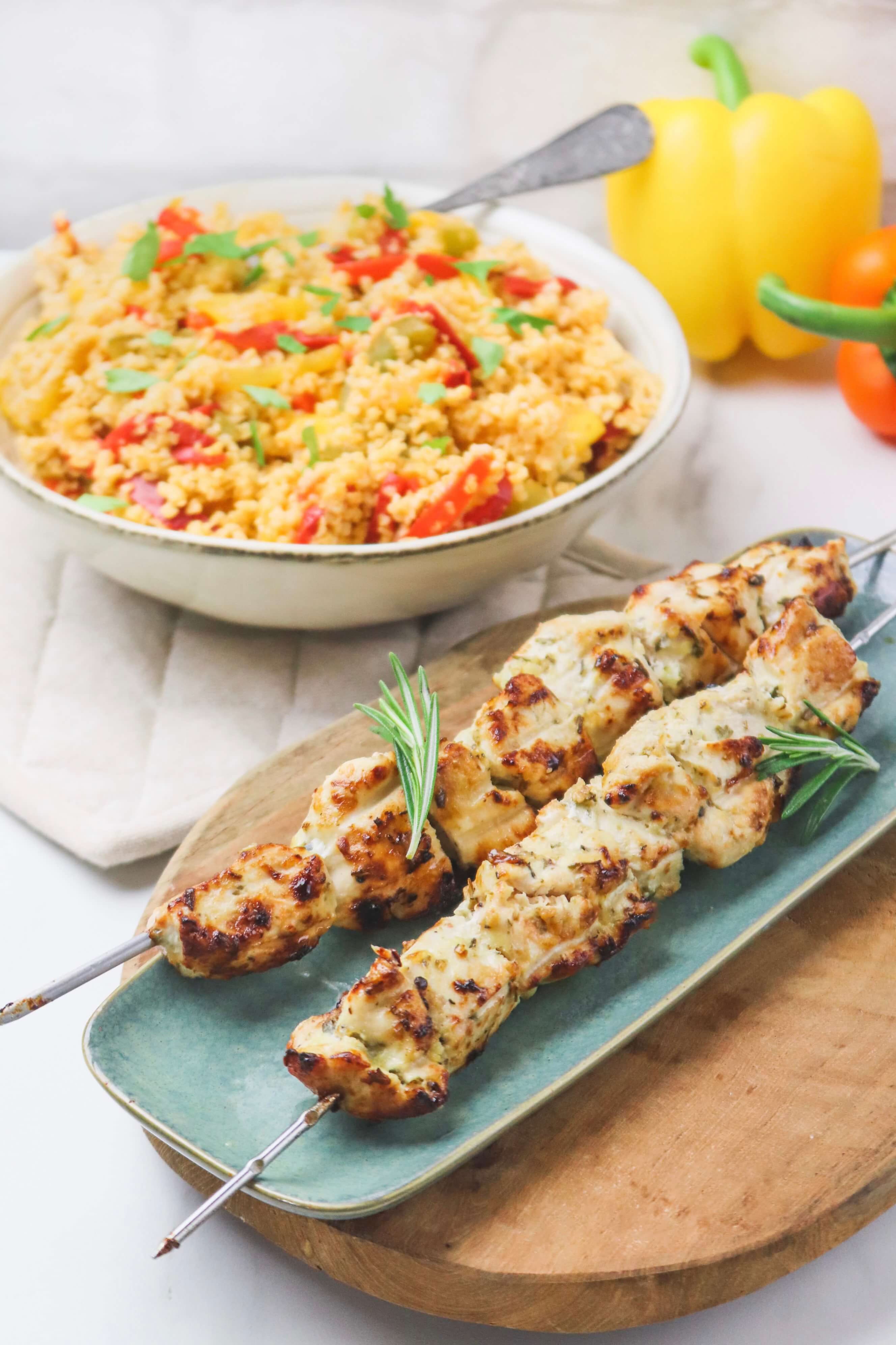 Brochettes de poulet mariné, poêlée de boulgour aux poivrons